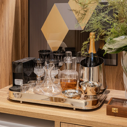 A Bandeja Oblonga em Prata é uma peça deslumbrante, com design leve e sofisticado. Essencial na montagem de um bar em sua casa.