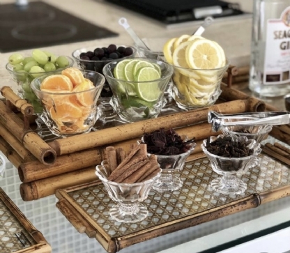 Bandeja em bambu, formato retangular, com trelhiça em palha e base de vidro.
