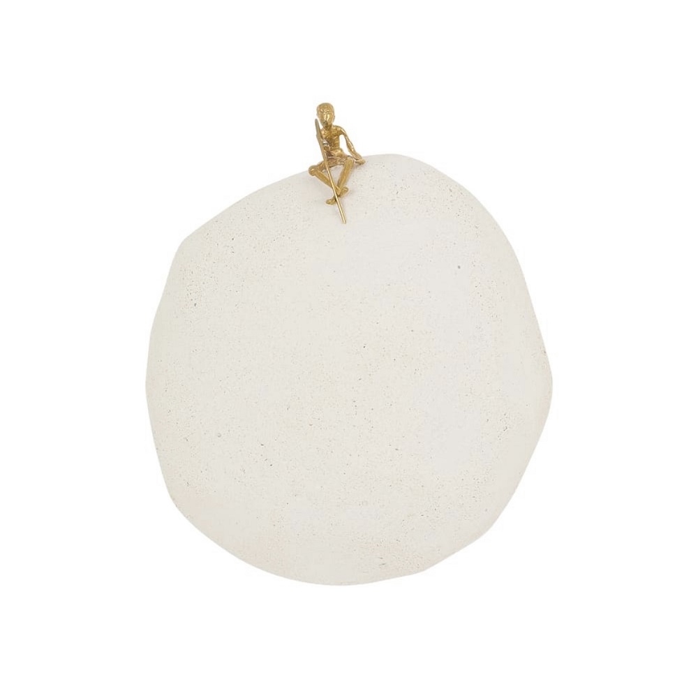 Escultura de parede em formato redondo, feita em concreto na cor branca, com pescador de latão dourado no topo, peça da Série Pescador "Sensibilidade que permeia o anzol de cada um".