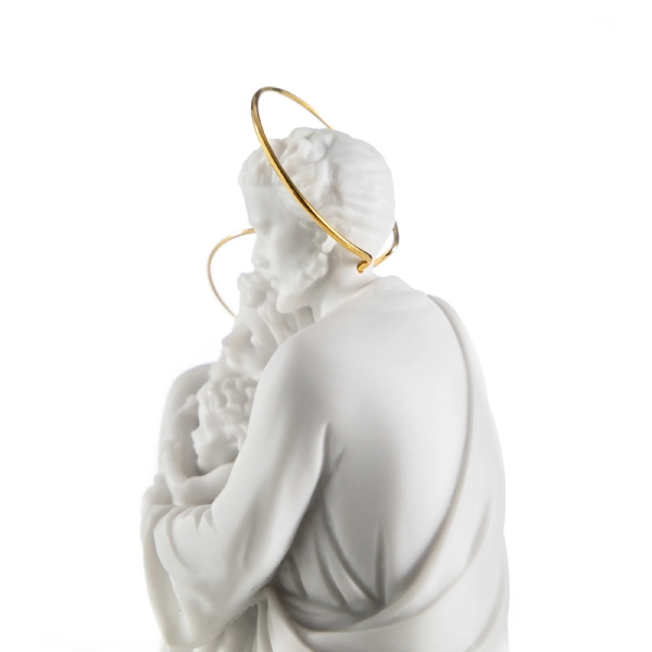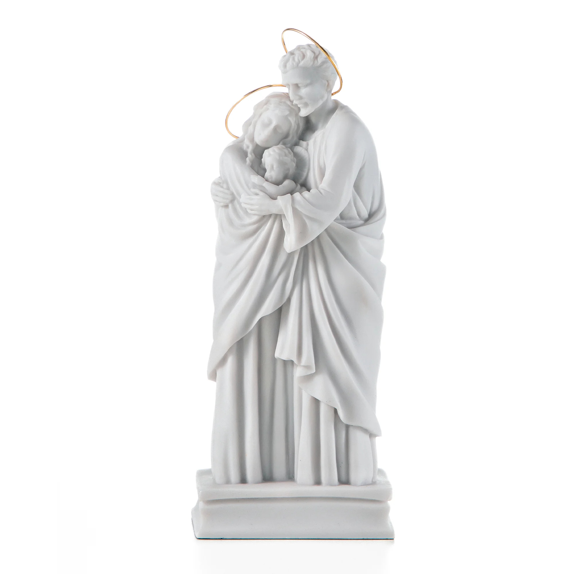 Imagem da Sagrada Família, em pó de mármore, na cor branca com coroa dourada.